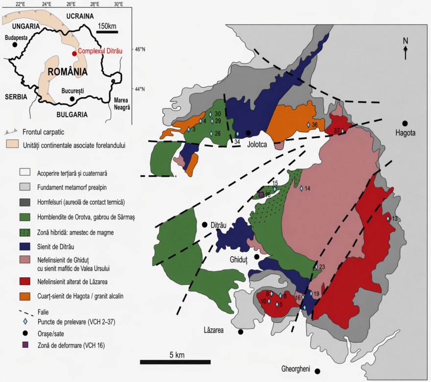 Harta geologică a Complexului alcalin Ditrău și localizarea sa în România