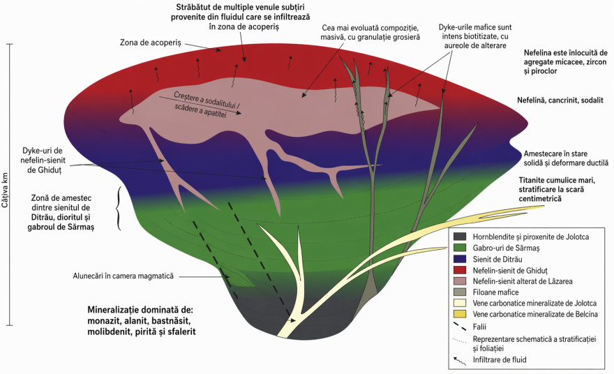 Model schematic al evoluției magmatice și hidrotermale a Complexului alcalin Ditrău