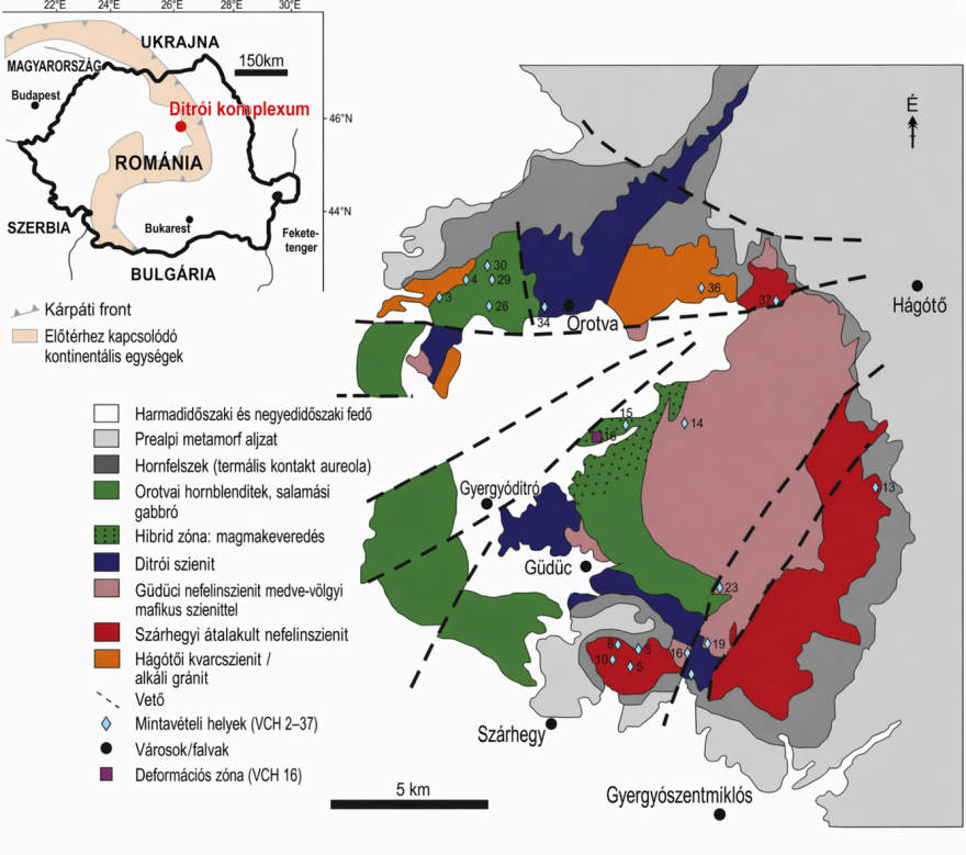 Forrás: Honour, V.C., Goodenough, K.M., Shaw, R.A., Gabudianu, I., Hirtopanu, P., 2018. REE mineralisation within the Ditrău Alkaline Complex, Romania: Interplay of magmatic and hydrothermal processes, Lithos, 314–315, 360–381, Fig. 1.