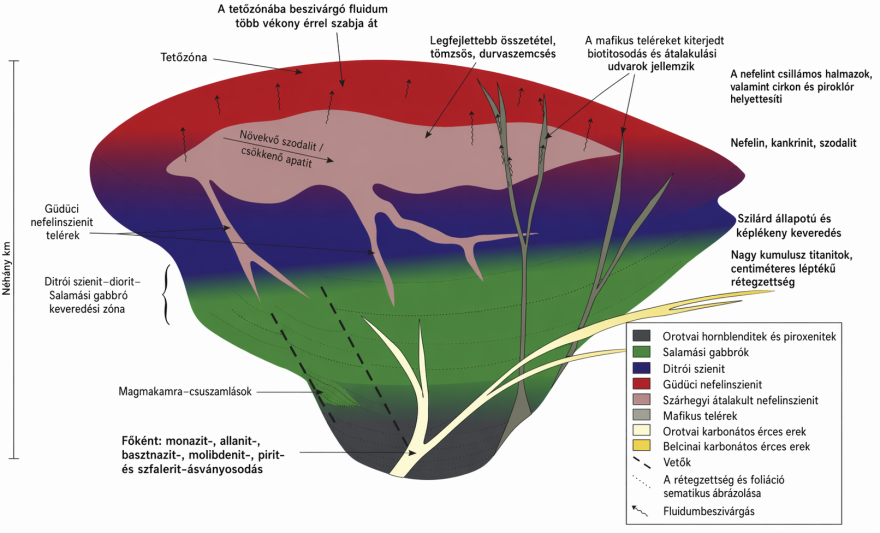A Ditrói alkáli masszívum magmás és hidrotermás fejlődésének sematikus modellje